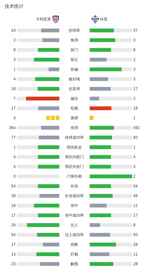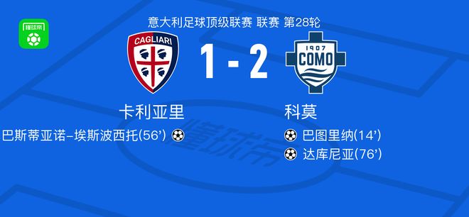 北京时间3月7日意大利足球甲级联赛第28轮,卡利亚里主场迎战科莫。比赛中,科莫率先取得进球,随后卡利亚里扳平比分,科莫再次进球锁定胜局。具体战报如下: 科莫球员巴图里纳打入一球,帮助球队取得领先;卡利亚里球员塞巴斯蒂亚诺-埃斯波西托破门,将比分扳平;科莫球员达库尼亚打入一球,为球队扩大优势。最终,卡利亚里1-2不敌科莫。
